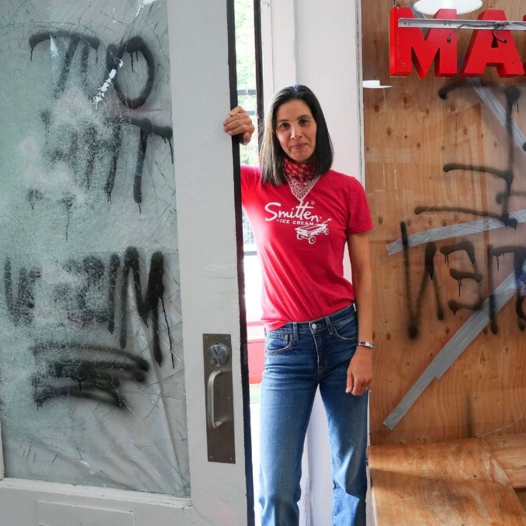 At first, Robyn Sue Fisher, who is Jewish, decided to close Smitten Ice Cream, and boarded it up. But then something changed. Fisher describes her emotional arc like this, “At first I felt fear and then I felt anger and then I felt a deep sorrow,” she said. “And then I felt empathy, and that’s how I got to love.”