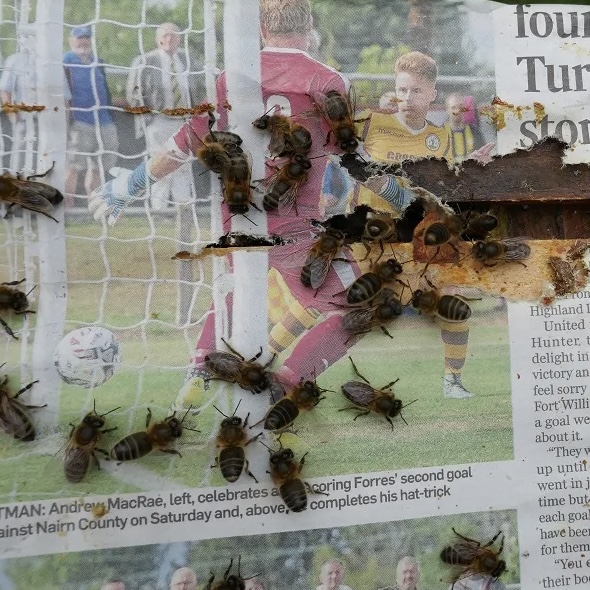 By the time the beekeeper opens the hive again, nothing is left of the newspaper except for a ring where the two hive boxes meet, and the two groups of bees will be living together in harmony.”