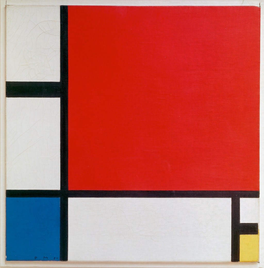 Between 1914 and 1916, working from the small town of Domburg, Mondrian [then] developed a series of abstract drawings and paintings inspired by the facade of a local church… By 1918, grids filled with rectangular planes of color began to emerge on Mondrian’s canvases.”
