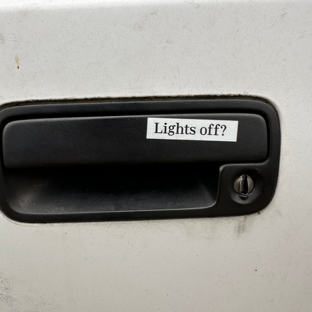 I was walking by an older, parked car and noticed a sticker on the driver’s door handle that read, “Lights off?” (You can see a photo of it at on-emotions.com)