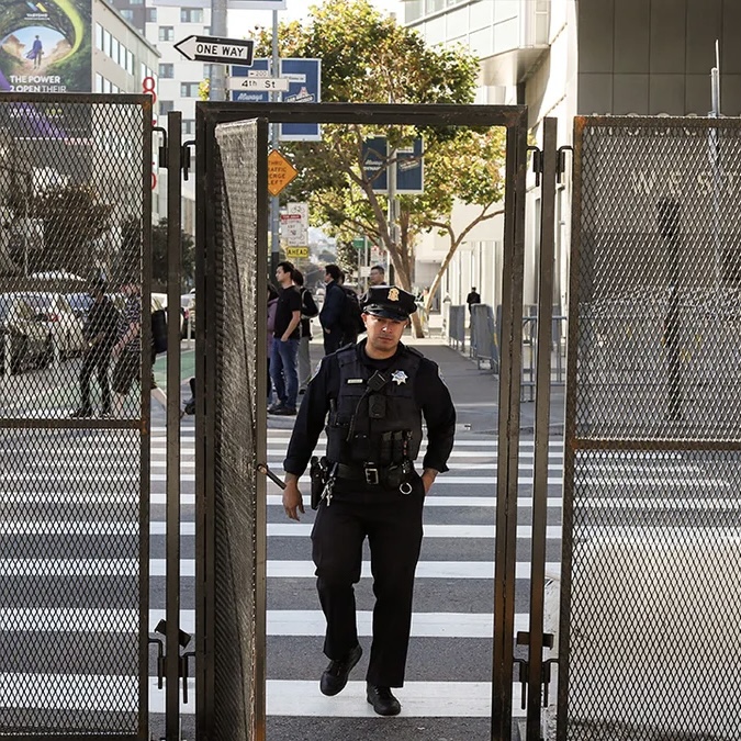 Police were posted everywhere as was metal fencing. At one corner we came across a 4-foot gap created for people to pass through. A police officer stood watch, and I watched him speak with a woman and then let her pass.
