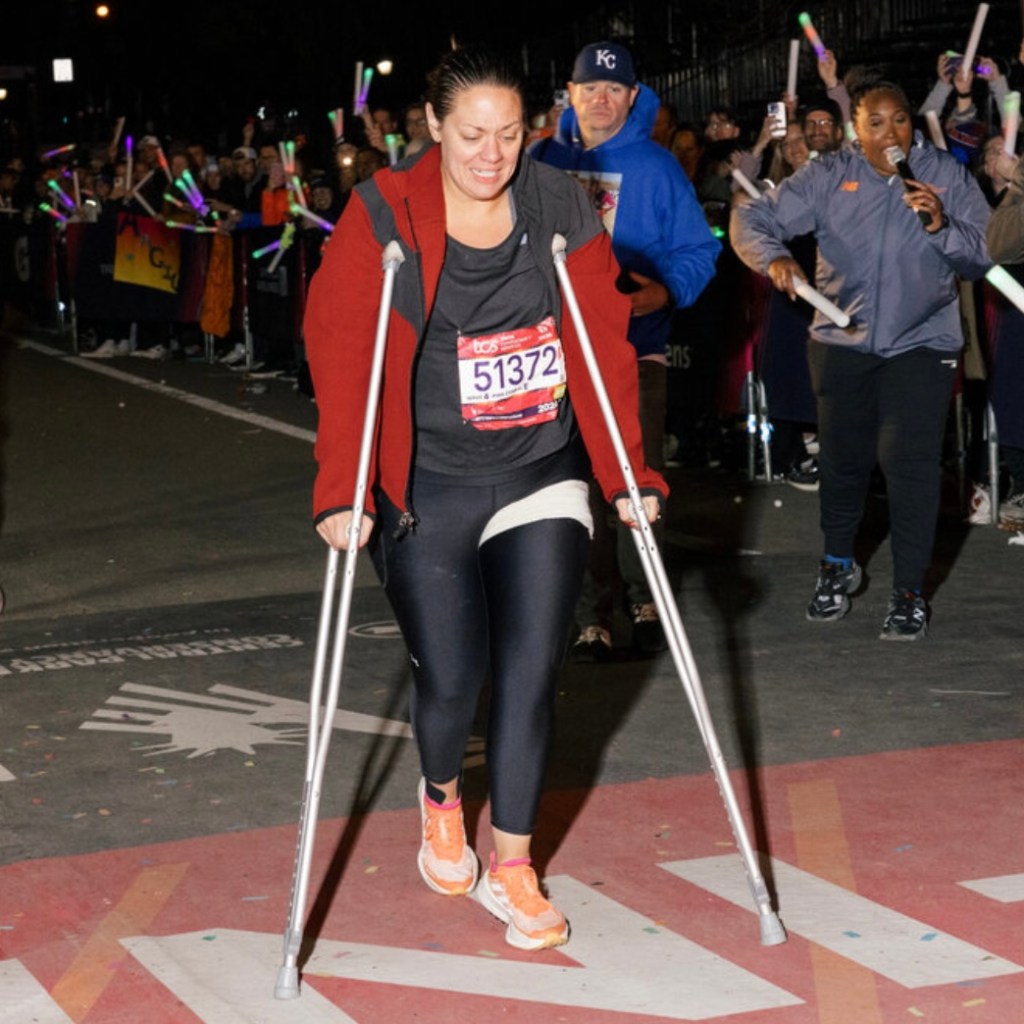 As she approached the finish line in Central Park, word reached the medics stationed there someone was finishing on crutches. They met her with a wheelchair.”